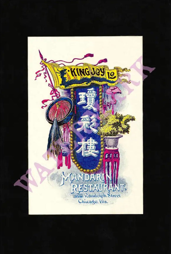 Known as "Chicago's Wonder Palace," King Joy Lo offered over 150 Chinese offerings which could be combined to create "shopper's novelty luncheons" served Mandarin style, and had an even larger American kitchen with some 300 dishes available. They even boasted "table telephone service all over the house". The Chinese use a traditional language-free method of indicating that an establishment houses a restaurant by flying a long yellow three-tailed triangular flag. Called a triple pennon, King Joy Lo's fancy version features swirly edge trim called flammules.