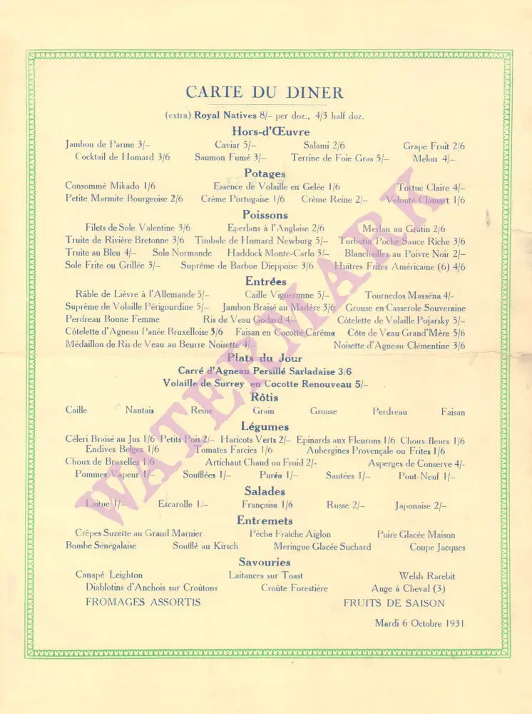 As you can see from the Carte du Diner, it was fashionable at the time for menus is high class establishments to be entirely in French. This was an extensive menu and a costly place to dine.