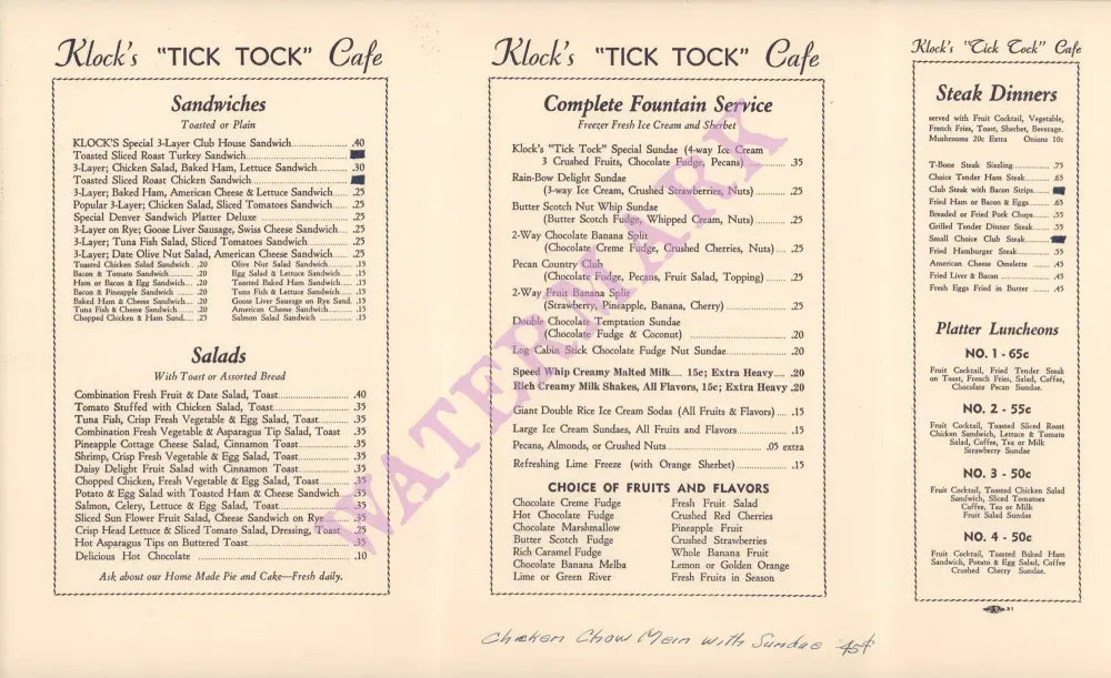 When the clock was ticking on appetite, customers could rush in and have a steak dinner for 75c or a three-layer sandwich for 40c. There were platter luncheon options and the special of the week of this menu was chicken chow mein and an ice cream sundae for the total cost of 45c.