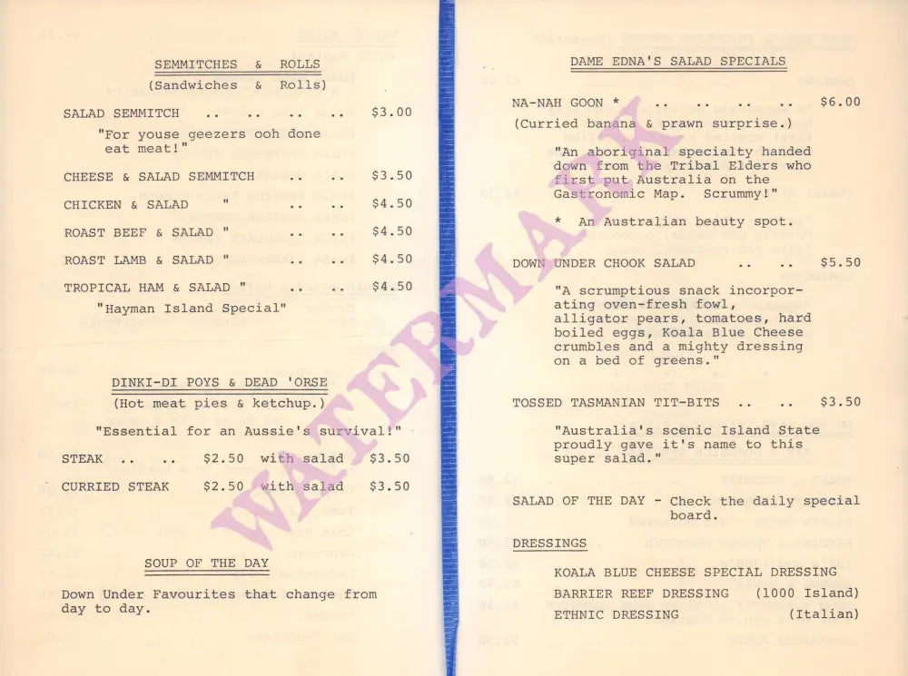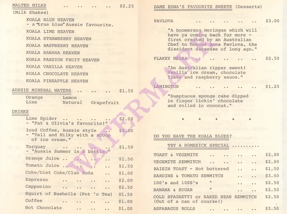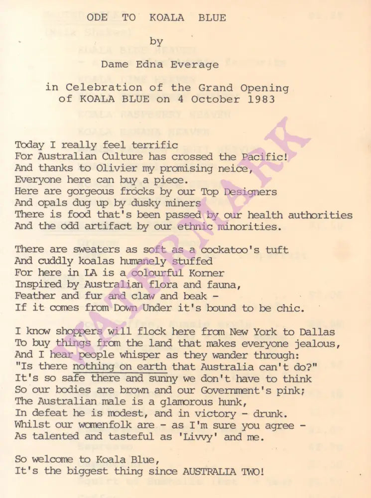 The launch was notable because of the presence of the Australian comedian and actor Barry Humphries, in his role as his famous character Dame Edna Everage. He contributed a hilarious ‘Ode to Koala Blue’ that was inserted into the menu.