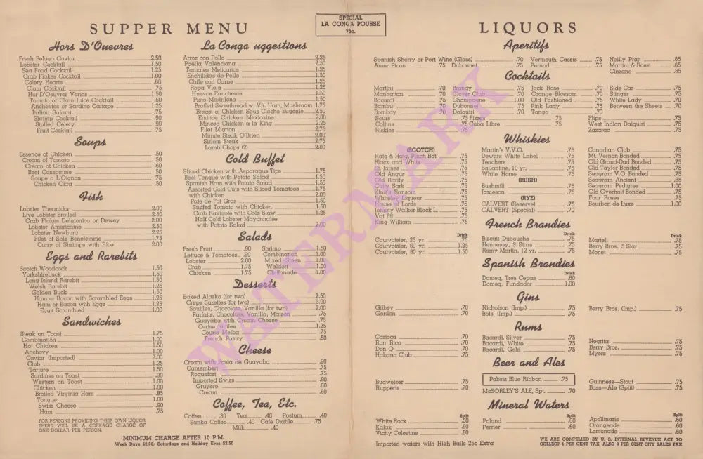 Where the conga dance (line), originally a street dance in Cuba, began its popularity in America. La Conga opened on Broadway and 51st in 1929 and by 1937 it was wildly popular in New York. The rest, as they say, is history. This fabulously black menu cover is from the early 1950s.
