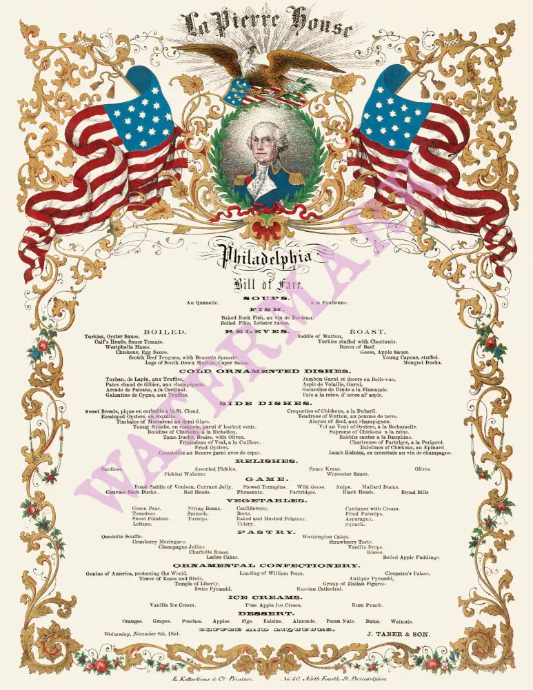 An American eagle appears at the top of the menu, perched over a portrait of George Washington flanked by American flags, creating a splendid trifecta of patriotic images. Gilded and tinted in a lithographic process using three stones, the menu was made by Eugene Ketterlinus, one of the first printers in the country to produce colored and embossed lithographs. He received an award for his work from the Franklin Institute in 1858, sixteen years after establishing his printing house at 40 North Fourth Street, a few blocks from the wharves that lined the river where Penn landed.