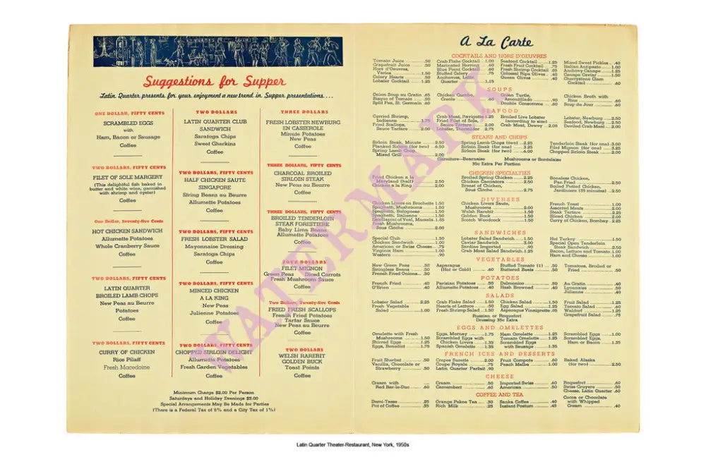A great, but unaccredited, Enoch Bolles image. A scantily clad waitress sends her tray flying in this lovely print of a menu cover from a legendary New York nightclub, The Latin Quarter. Opened in 1942 in Times Square by Lou Walters, father of newscaster Barbara Walters, the club was famous for lively cabaret acts featuring can-can dancers and showgirls. Frank Sinatra and the Andrew sisters were among the big-name musical stars that performed in the elegant auditorium.