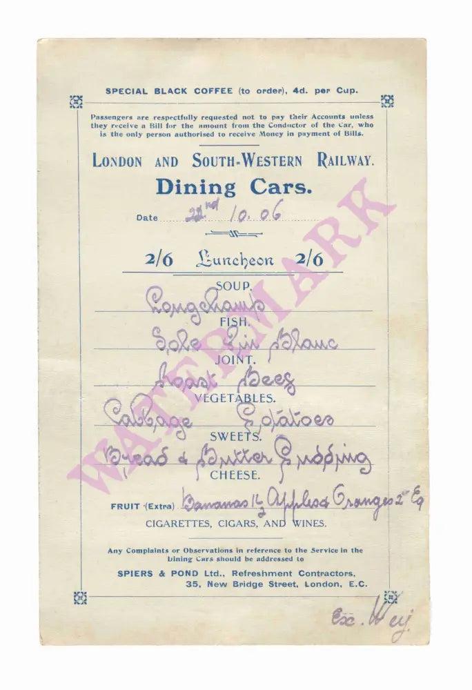 The London and South Western Railway Company served the south and west of England from 1838 to 1922. They were one of the great pioneers of Britain's rail network and were responsible for the rebuilding of Waterloo and its becoming one of the great stations of the world. Their trains offered all three classes of passenger Breakfast, Luncheon and Dining Car carriages which served Table d'Hôte meals at set times during the day and evening. This two shillings and sixpence (12 1/2 pence in decimal) luncheon menu from October 1906 would have cost the 2010 (only data available) equivalent of £10.50 using the retail price index or £42.25 using average earnings. So not inexpensive whichever measure you use. On offer for this luncheon was Longchamp Soup (pea and ham), Sole in white wine or Roast Beef both served with cabbage and potatoes and to finish you off Bread and Butter Pudding, Cheese and if you still had room you could, for 3p extra, also have fruit.