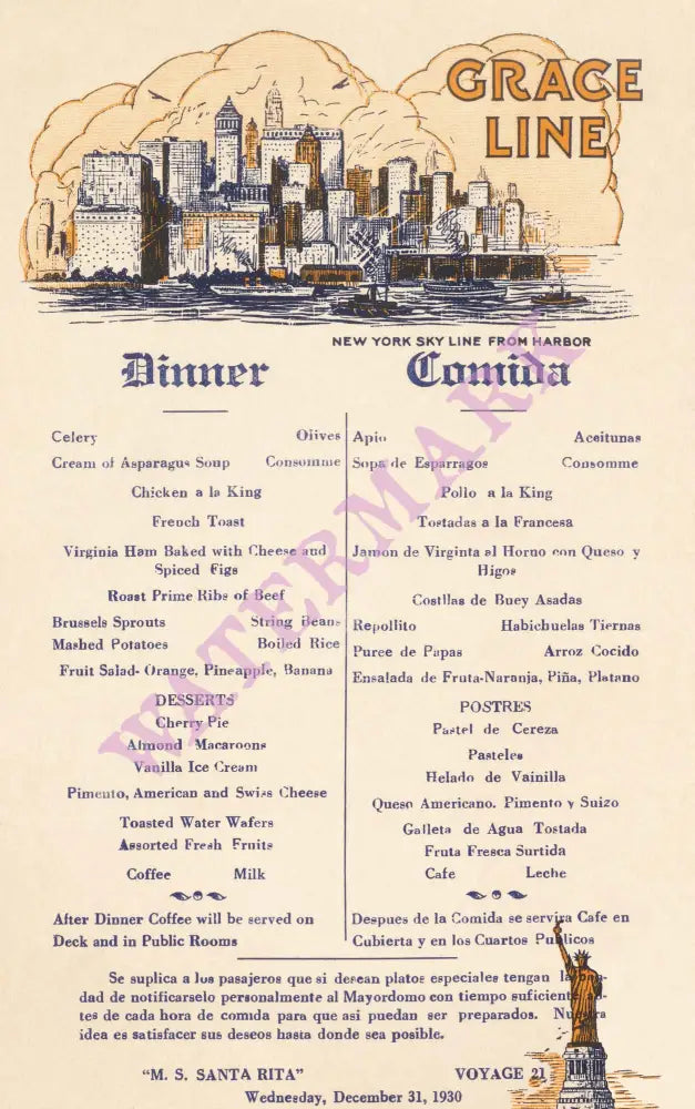 The New York sky line must have seemed like a mirage after days at sea, often in bad weather, and the illustration on this 1930 menu from the Santa Rita makes it look like the city is shimmering. The Grace Line ran services from Peru to New York, carrying passengers, cargo and mail.