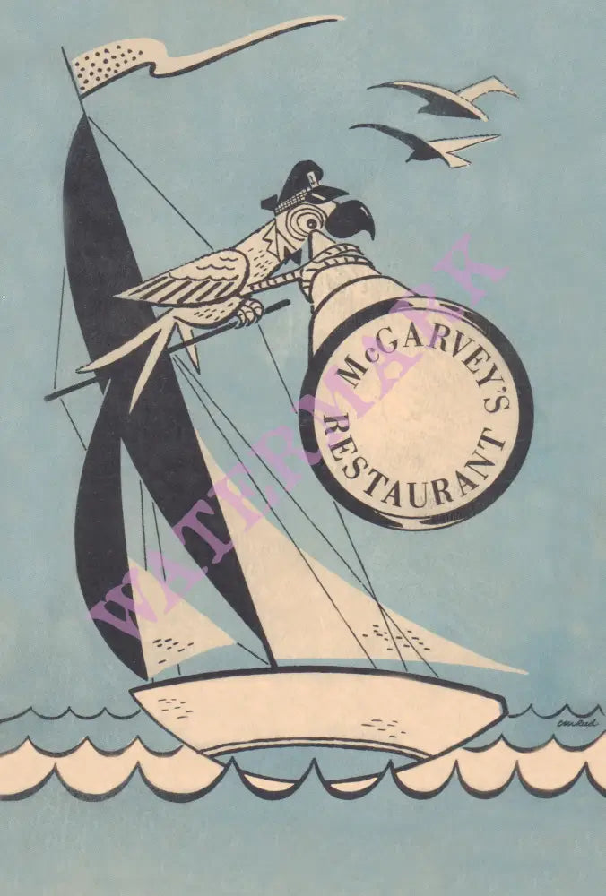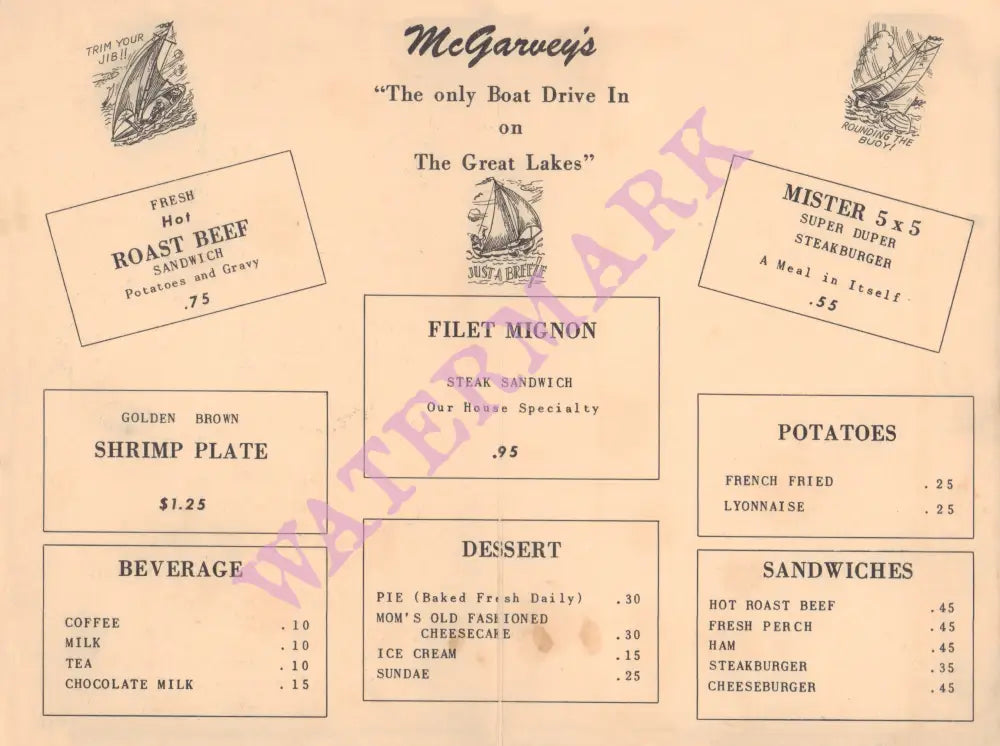 The witty 1930s menu cover belonged to the landmark, nautically-themed McGarvey’s situated in Vermilion, Ohio. It was the only boat drive-in on The Great Lakes.