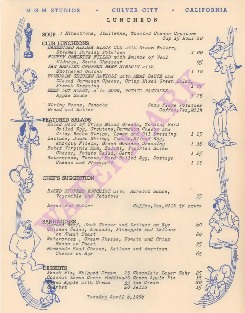 In its heyday, MGM was the largest and most glamorous film studio in Hollywood - except it wasn’t actually located in Hollywood but a few miles down the road in humble Culver City. Founded in 1924, with a roaring lion as its symbol, Metro Goldwyn Mayer had a stable of big stars including Elizabeth Taylor, Spencer Tracy, Katharine Hepburn, Marlene Dietrich, Lucille Ball and Desi Arnaz, James Stewart and Gene Kelly. Between 1937 and 1957, it also had an in-house animation studio which produced many loveable cartoon characters - portrayed on the interior menu - such as Barney Bear, Droopy and Tom &Jerry. The Commissary catered for the hundreds of people who worked on the massive studio lot and in this 1958 menu some of the dishes were named after weight-conscious MGM stars. There are salads for actress Elizabeth Taylor and dancer Cyd Charisse and the Parsonette salad refers to the notorious gossip columnist Louella Parsons who could make or break careers.
