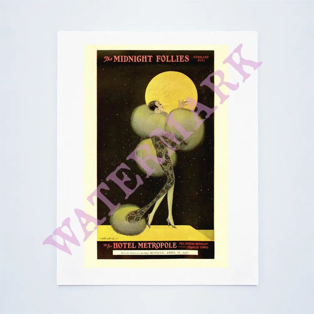 This is the play bill and supper menu from the show called The Midnight Follies at the London Metropole hotel in 1927. The review included the famous American dancers Rosita and Ramone in their first London appearance. Supper was very expensive, and offered only the best champagne and foods. The menu cover shows an elegantly dressed lady being kissed by the moon as she leaves the hotel.
