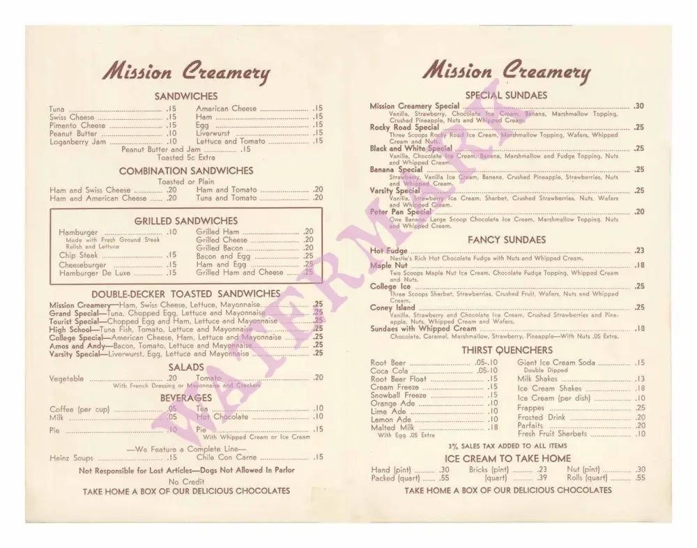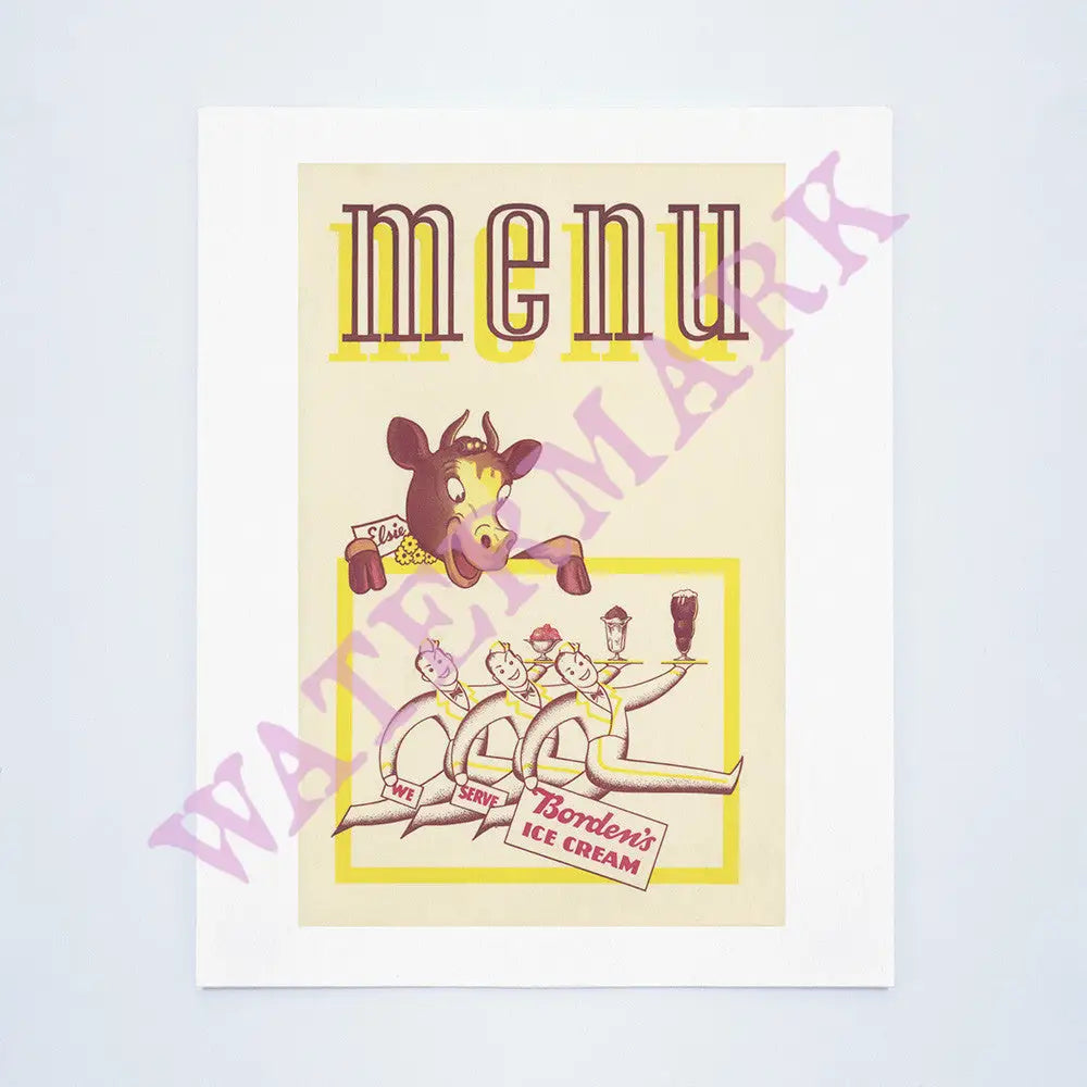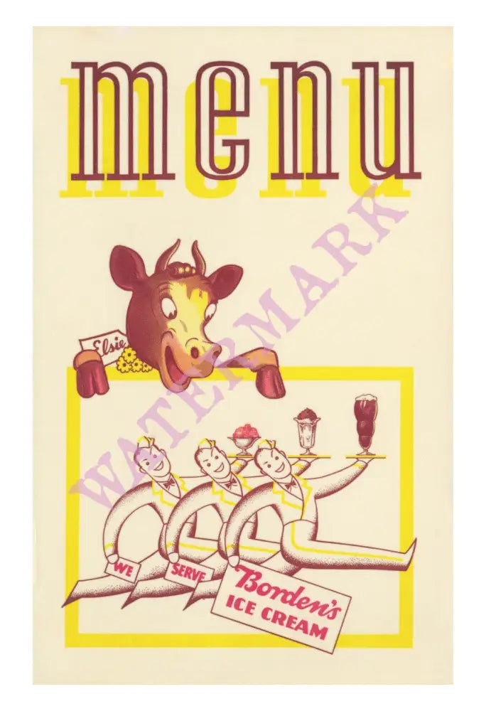 The menu cover shows the famous Elsie The Cow, the mascot of Borden ice cream, which supplied The Mission Creamery and which remains a popular brand today.