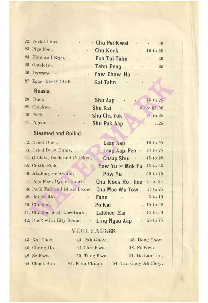 On the menu was Plain Fried Sharks Fins for a dollar and a half, Chow Min ( not Mein) for 35 cents and raw Chinese Water Chestnuts for 15 cents. Long Suey and Suey Shin tea cost 15 cents a pot.