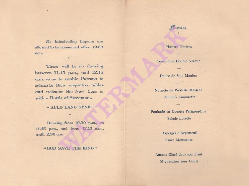 This charming menu cover showing 16 elves helping to open a bottle of champagne was for New Year’s Eve 1920-21. The interior menu is written in French and includes a tribute to George V, the King.