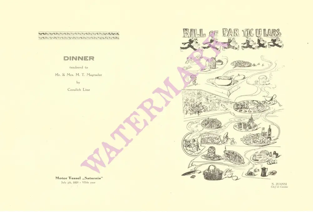 This 1929 menu cover is a glamorous portrait of the nightlife on board the Italian-owned Saturnia ocean liner which plied the route from Genoa to New York via Naples, Cannes and Gibraltar. Long days at sea were obviously the excuse to have parties in the evenings, though we don’t think the passengers would have been quite as well-dressed as the artist implies. The interior of this menu has an illustrated Bill of Particulars.
