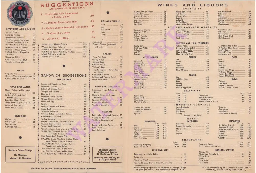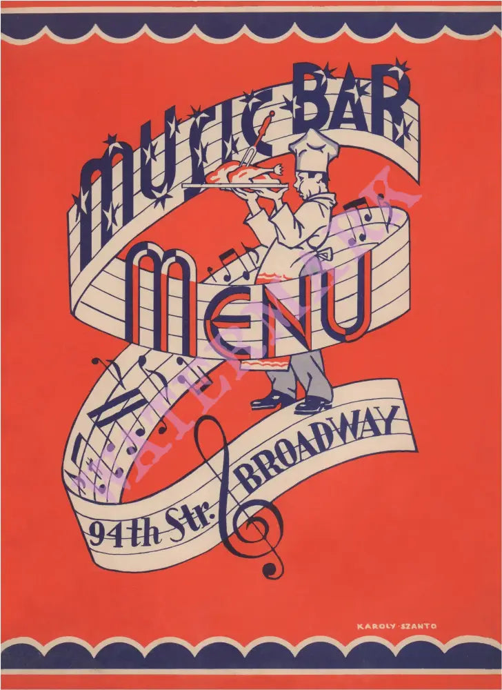 As many servicemen and women flocked to the city for precious days of leave, they wanted to forget about WW2 and let their hair down. Audiences were packed into theatres on Broadway - Cole Porter’s Broadway Melody of 1940 was a big hit - and afterwards couples would head to jazz clubs or to restaurants like The Music Bar on 94th Street to eat, dance and listen to music. Musicians who worked here probably earned a decent living while hoping for their big break. The attractive menu cover is by Hungarian artists Andrew Karoly and Louis Szanto who both emigrated to America in the 1920s. Karoly participated in the Federal Art Project ordered by President Franklin D Roosevelt during the Great Depression to paint murals on public buildings in the 1930s, mostly in Cleveland. The pair later joined forces for commercial works like this charming and inventive menu cover. As you will see from the interior menu, a charge of 75 cents to $1 per person was levied to cover the cost of entertainment at the weekend and the festivities at the Music Bar went on till 4am nightly.
