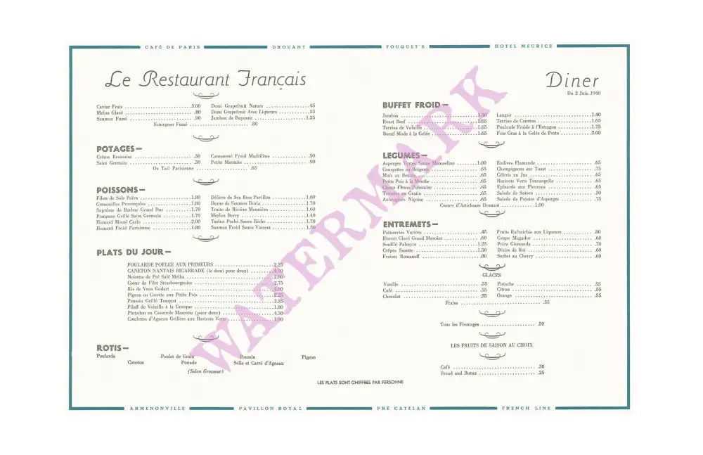 Created by a Syndicat des Restauranteurs which included the Café de Paris, Drouant, Fouquet's, Hotel Meurice, Pavillon Royal, Armenonville, Pré Catalan, and the French Line, Le Restaurant Français in the French Pavilion was the most renowned of the 112 restaurants at the 1939-40 World's Fair in New York. The cuisine, service, and décor in the 350-seat, glass-walled dining room, made an astounding impression on the American public. It was run by restaurateur Henri Soulé who went on to open Le Pavillon on East 55th Street in 1941.