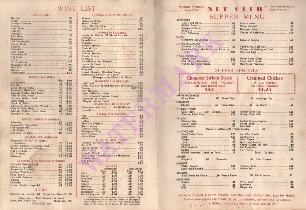 The Nut Club at 99 Seventh Avenue South was a Greenwich Village nightclub catering to tourists. One of its quirky attractions was 'cockroach racing.' It closed its doors in the 1950s.