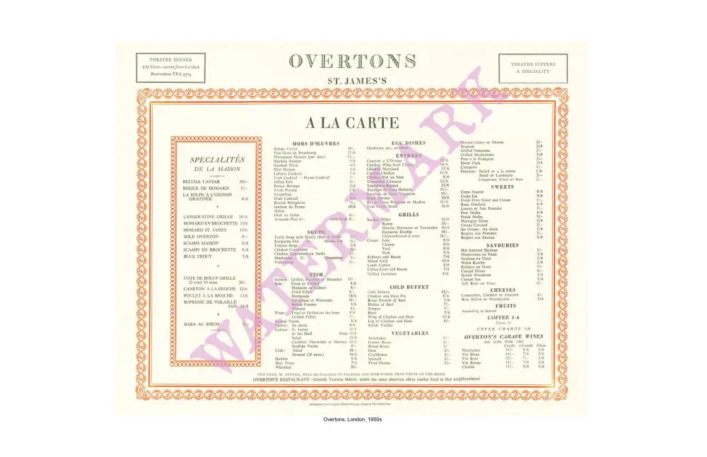 The pleasures of dining out are perfectly captured in this menu cover by the esteemed English artist Edward Ardizzone. He was commissioned by Overton's restaurant, located in the St James district of London, to illustrate London high society at play. Portly men brandish glasses of claret or chomp cigars alongside their pretty wives and we love the solemn waiters in formal dress, especially the one bearing a steaming hot casserole to the table. The late 1950s a la carte menu featured English favorites like calves liver and bacon and hot buttered shrimps on toast. Ardizzone was an admired writer and illustrator of children's stories and other books. By all accounts a charming gentleman, he enjoyed the convivial aspects of dining in a restaurant and this illustration perfectly captures an era that is now long gone.