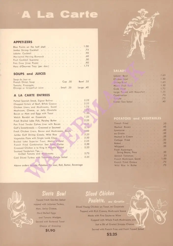 An old photograph of the place shows a low-slung building with colorful neon signs on the roof. There was a cocktail lounge, dining room and Caribbean Room for private parties. The club also advertised free parking and drive-away service.