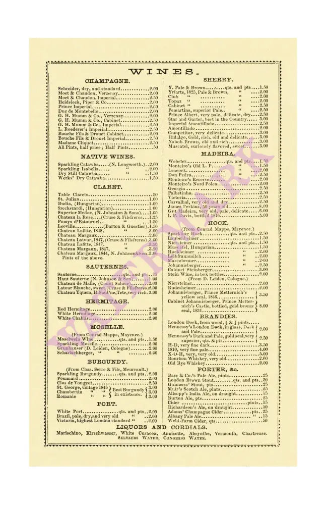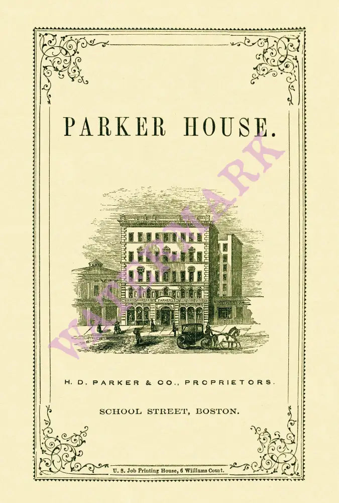 Parker House was founded by Harvey D Parker in 1855 in Boston and if its walls could talk, it would tell amazing stories. Charles Dickens, visiting from England, stayed here and wrote to his daughter describing it as an “immense hotel” with many public rooms and boasting that he had a bath with hot and cold running water. Politicians who have stayed here range from Ulysses S Grant to President John F Kennedy. Babe Ruth used to relax here after playing for the Boston Red Sox. It remains the longest continuously operated hotel in America. This menu cover is from 1860, five years after the hotel opened, and the interior lists a superb range of wines and liquors.
