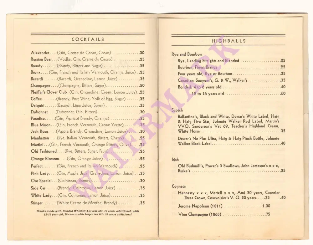 The 1930s was the golden era of menu design and this simple but striking design of a cocktail glass was created for Pfeiffer's in Buffalo, New York. At that time, the city had a large Russian population and the drinks list of the Russian Bar comprised seven pages and included flips, daisies, rickeys, sours and smashes.