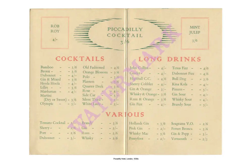 This one of our favorite cocktail menus because of the clarity of the design. The graphics are wonderful and we love the clever minimalist illustration of the glass with the cherry at the bottom. The Piccadilly Hotel was built in London in 1908 and was one of the capital city's most luxurious places to stay. There were 300 bedrooms, several top-class restaurants and Masonic Temples in the basement. Staff drew water from the property's own well so guests did not have to drink from the city's then questionable public water supply. By the time a guest of the hotel could sip a Piccadilly Cocktail from this 1950s list, there were no concerns regarding the quality of the ice in one's glass. The hotel is now the Le Meridien Piccadilly.