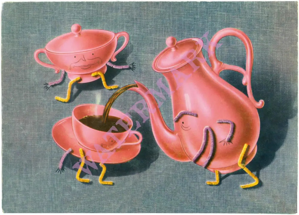 This dancing coffee set is very endearing and comes from a fine old diner that closed long ago in Cynthiana, Kentucky. Positioned on route US 27, The Pine Villa Restaurant in the 1940s was a popular stopping off point for motorists on their way to Cincinnati as well as a favored spot for local farm workers. Look at the hours that it was open – from 6am till 1am. Motorists would stop for coffee, hot cakes and breakfast, lunch or dinner, and then they would fill up their cars with gas and get on their way. It wasn't a fancy place as you can see from the photos and from the menu, but it was one of those restaurants that provided a valuable service to a rural community. On the interior, we especially like the cute little waitress who is offering the Quick Service Special – service with a smile!