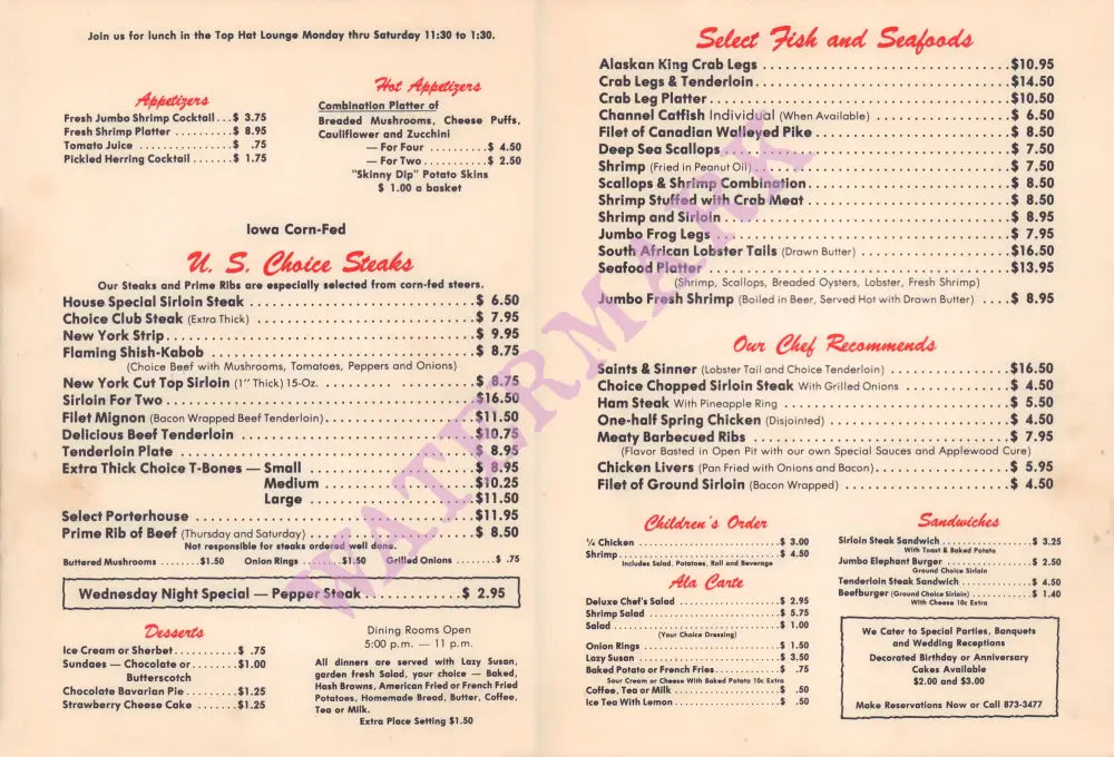 As well as steaks, the restaurant served seafood, and there was a cocktail lounge overlooking the river. Boat docking facilities were available for hungry customers who arrived by water to this charming tourist town.