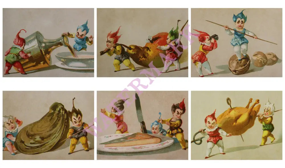 According to 19th century lore, pixies were benign but mischievous creatures that usually appeared at night, gathering in large numbers when people were asleep. They had slanting eyes and hair that pointed upwards and they were plump little sprites. This charming series of illustrations was found in a journal kept by a wealthy person as a souvenir of a Grand Tour of Europe. They show pixies making off with food from a dinner table. Two of them wrestle to open a mussel shell, others triumphantly haul off a chicken or grab wine and cheese. Another pixie dances on a walnut while his friend keeps watch. These fantasy images are likely to have been collected as a souvenir of dinner on board a ship since they were all pasted onto the same page dated 1877. The opposite side of each illustration was blank but the gorgeous colors of these whimsical pixie images are still vibrant after all this time.