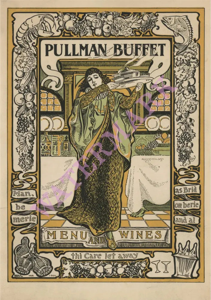This beautiful menu cover harks back to the days of luxury train travel across the United States. It was all thanks to American engineer and industrialist George Pullman who, after spending an uncomfortable night sleeping upright during a train journey, was convinced passengers would pay for better amenities. He established his company in Chicago in 1867. Passengers could rest in sleeping cars and eat in dining cars decorated with chandeliers and leather banquettes as trains sped from city to city. It must have been a delightful way to travel. Freshly prepared gourmet meals were served by uniformed waiters and champagne, liquor and beer were served - though Prohibition laws in many states restricted when these beverages could be served. This menu cover, courtesy of the University of Las Vegas Menu collection, is from the beginning of the 20th century and is in the Art Nouveau style.