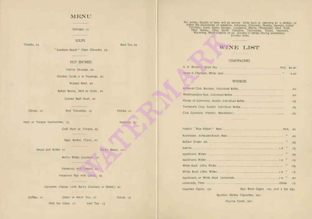 Pullman Buffet Menu and Wine List Early 1900s