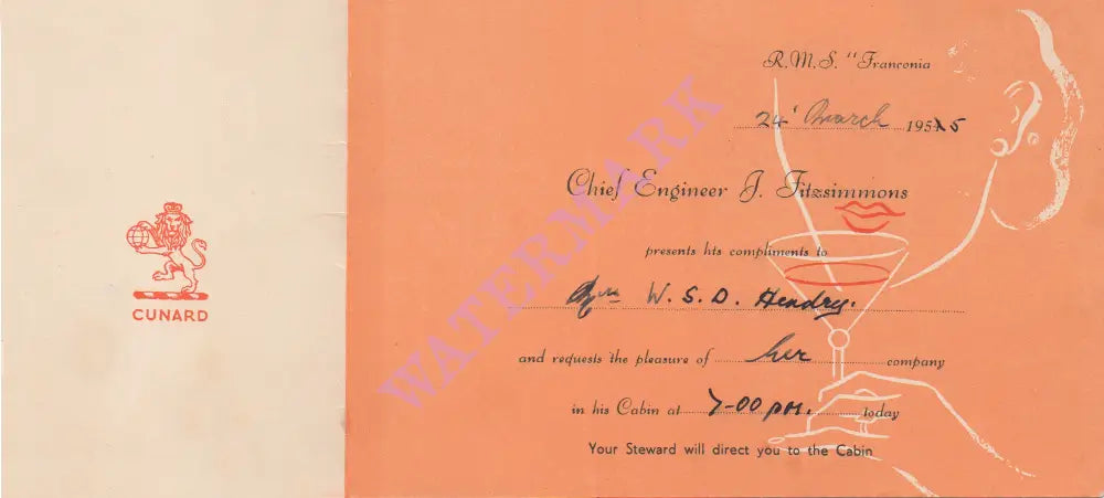 Intriguing and rather striking invitation card from the R.M.S. Franconia’s Chief Engineer J. Fitzsimmons in March 1955. He is inviting a Mrs Hendry for drinks in his cabin. The R.M.S. Franconia was an ocean liner operated by the Cunard Line from 1922 to 1956. She spent her final years sailing the Canadian route from Liverpool to Quebec and Halifax.