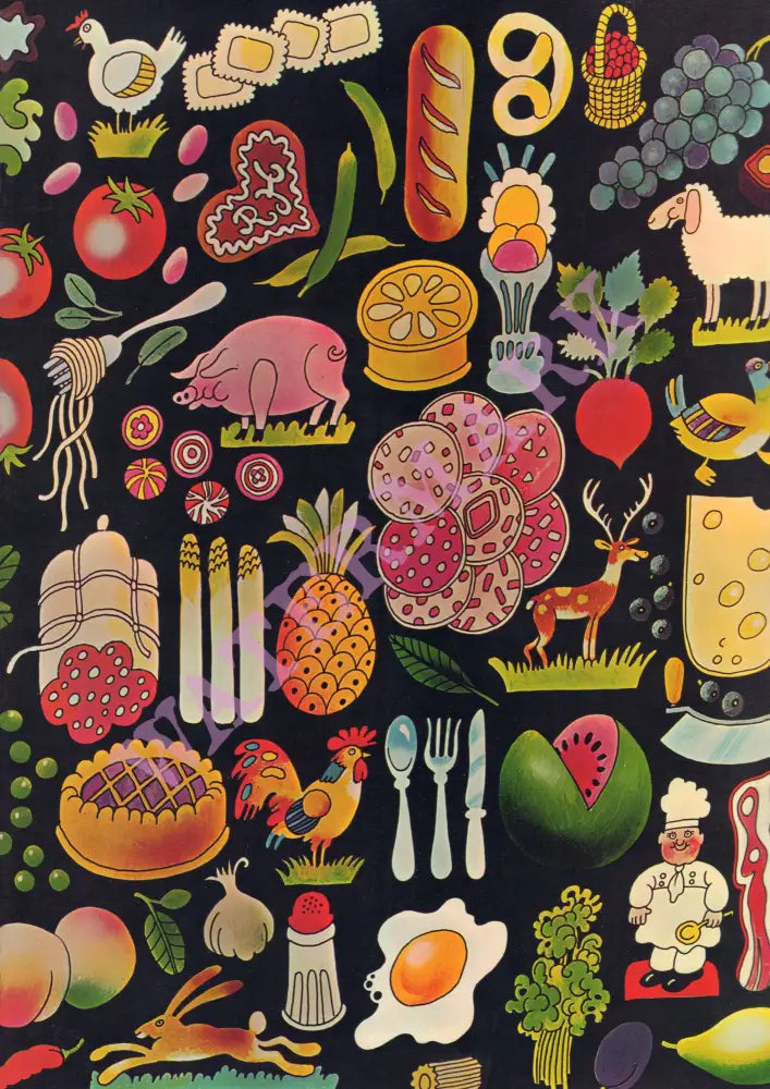 Cherries, beets, pasta, herbs, seafood, steaks and even a gingerbread man are among the colorful drawings, and we believe this lunch menu is from the 1970s.