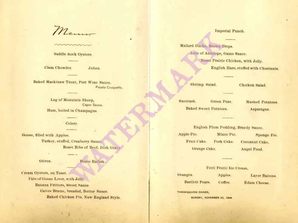 This 1884 menu illustration from the Revere House Hotel in Clinton, Iowa, shows a turtle pulling the other ingredients of a Thanksgiving dinner - a crab and a frog - back into a pot.