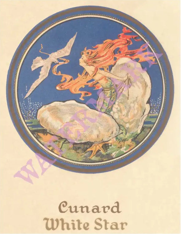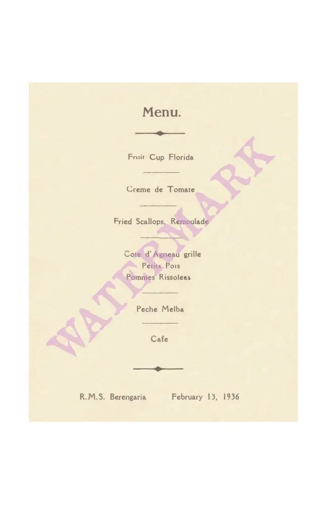 The RMS Berengaria sailed from Southampton to New York with up to 4,000 passengers on board on every trip. This vintage menu shows a flame-haired siren or mermaid rising out of her shell bed to greet a seagull. Her hair looks like the tentacles of an octopus. It’s an imaginative illustration, all part of the romance of being at sea. The food on offer in this 1936 menu may have been for a private dinner on board.