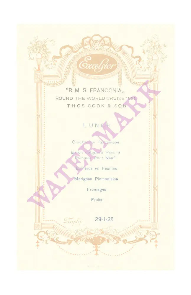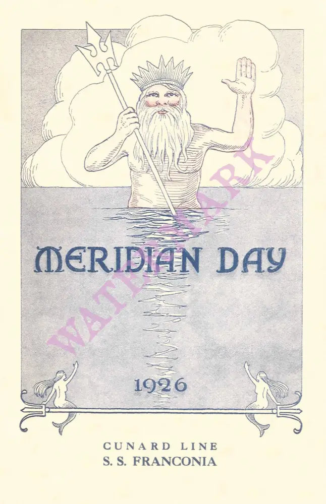 Meridian Day celebrates the day on which a ship in the Pacific crosses the International Date Line, losing a day going east and adding one going west. Neptune, Roman God of the sea, was often on the front of menu covers on these occasions and he appears on this one from the S/S Franconia dated 1926.