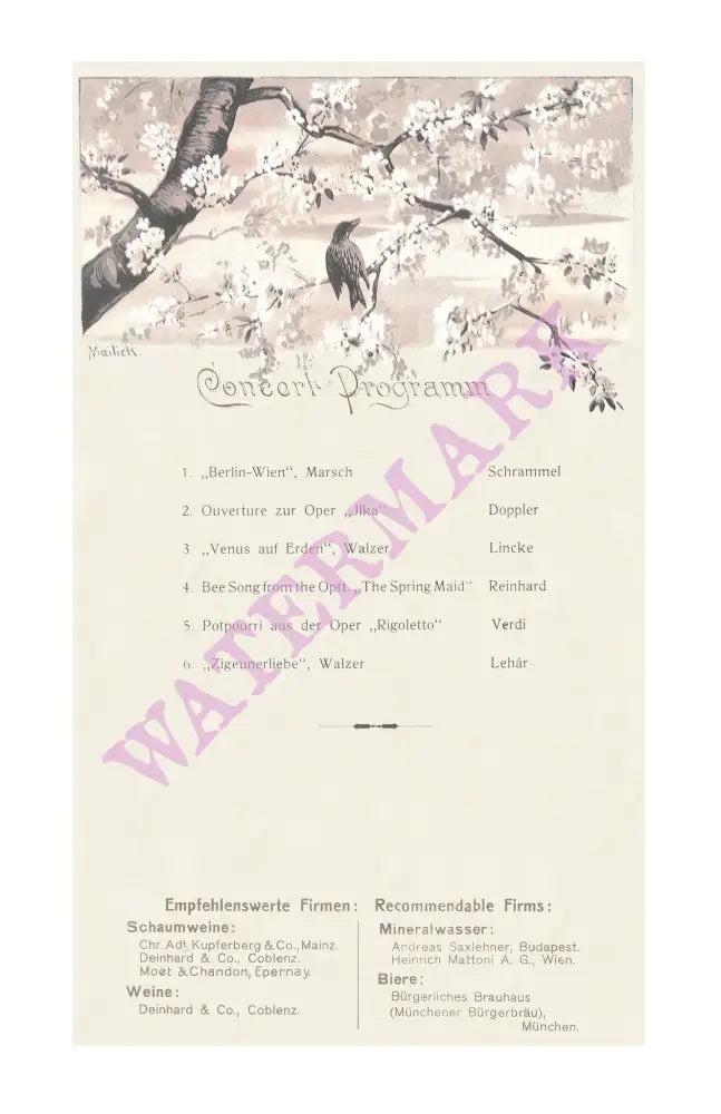 This beautiful 1911 menu features a mermaid rising out of the ocean after she escaped being caught in a fishing net. Her silvery-green dress is made from the waves and she is holding a fish in her hand. This was a first class menu that came from the sumptuously appointed S/S George Washington built for Bremen-based North German-Lloyd. The luxury liner sailed from Europe to New York and could carry 2,900 passengers. In 1912, it passed a large iceberg south of Newfoundland and radioed a warning to other ships including The Titanic, which sank near the same location.