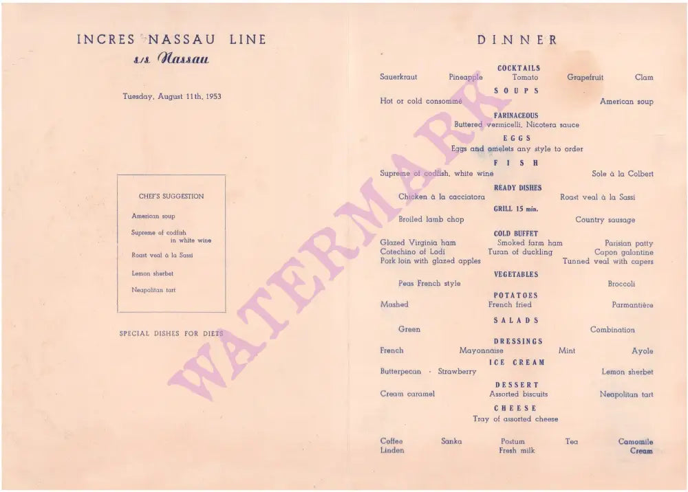 The S.S. Nassau was originally built in 1923 for P & O and launched as the Mongolia. In 1950 she began operations with the Incres Nassau line and was renamed Europa until a refit in Genoa saw here being renamed the Nassau. She served the New York - Nassau route until 1961 when she was sold eventually being scrapped in Osaka in 1964.
