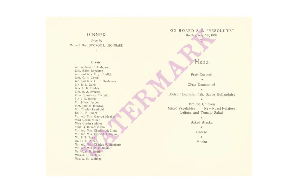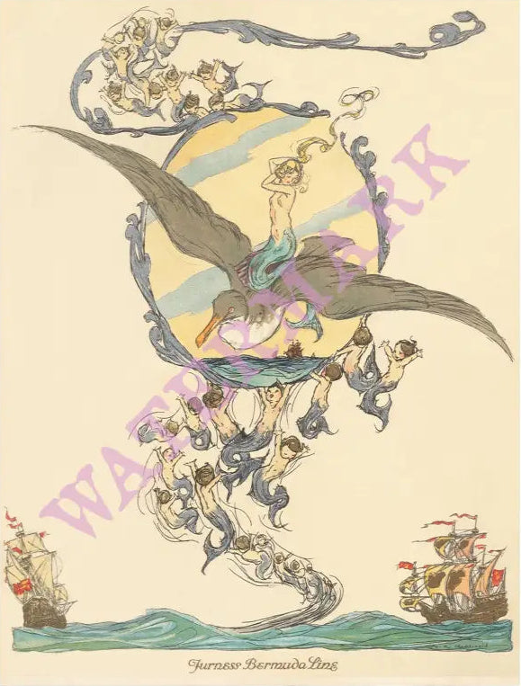 Mermaids were popular illustrations on vintage cruise ship menus and this is a particularly lovely example. It shows one of these mythic aquatic creatures riding on a seagull while a crowd of mermaid babies help raise them up. In the background are two galleons. This was for a private dinner on board the S/S Resolute in 1930, hence the relatively simple food offering, and the charming picture on the back suggests it was for a couple celebrating a wedding or an anniversary.