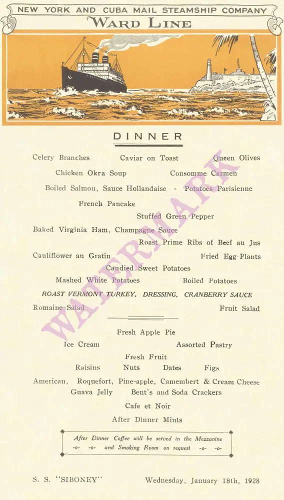 The SS Siboney plied the New York-Cuba-Mexico route in the 1920s for its owners, The Ward Line. Part passenger and part cargo ship, it brought immigrants to their new lives in the US. The elegant illustration at the top of this 1928 menu print shows the vessel ploughing through froth-topped waves towards its next destination.