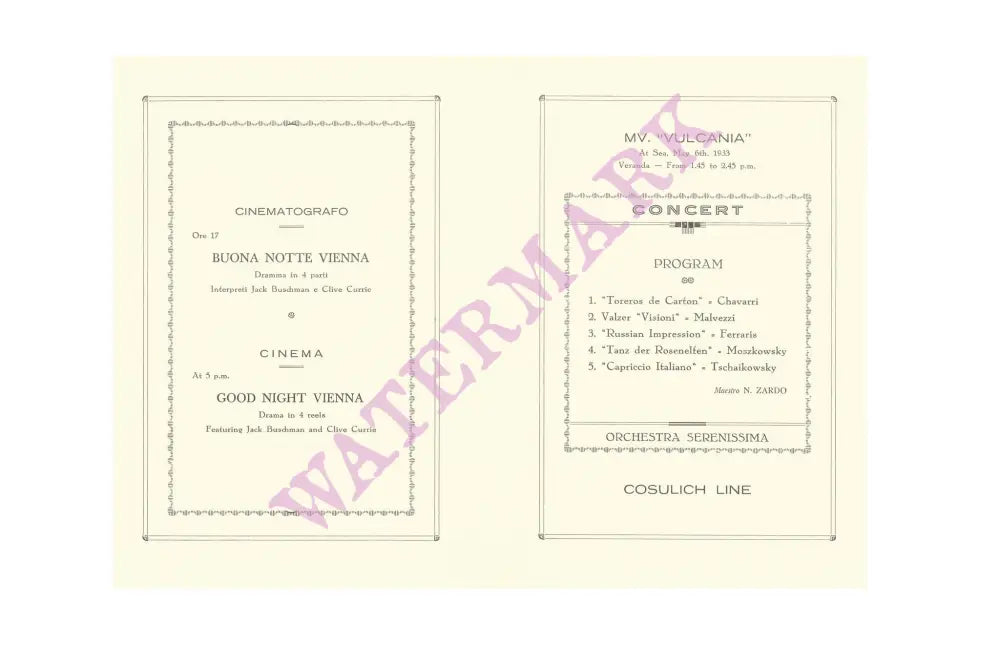 This saxophone playing mouse appears on the cover of a stylish 1933 menu from The Vulcania ocean liner, operated by the Cosulich Line.  There was accommodation for 1800 passengers and the interior of this ship was luxurious. This is an entertainments menu, announcing a classical music concert led by the Orchestra Serenissima followed by a film (in four reels) in the ship’s cinema.