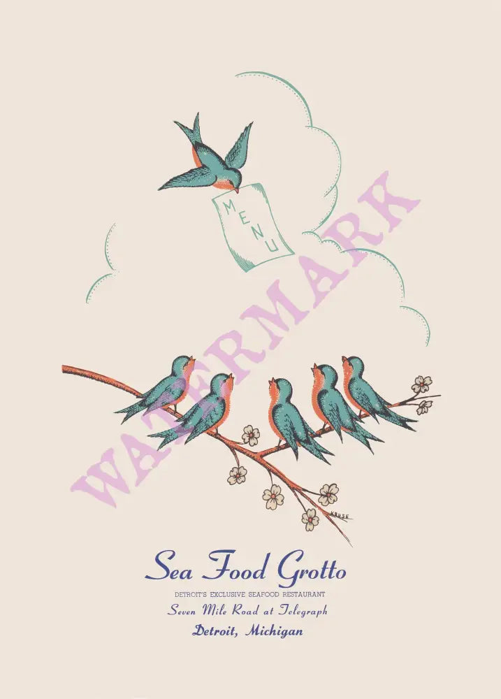 This charming menu cover from the Seafood Grotto shows a bluebird carrying a menu in his beak to his five friends – maybe they were going to order takeout right to their branch