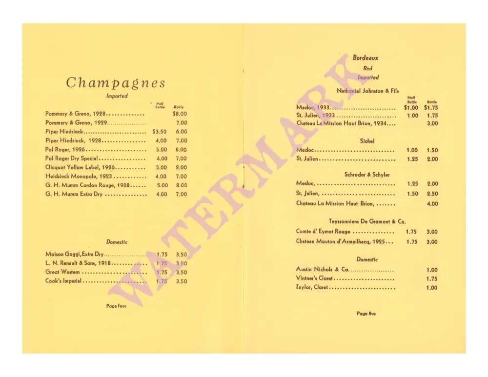 Correct drinking is an art, the interior of this menu notes rather pompously, while advising clients who had been starved of “proper beverages” during Prohibition to enjoy fine wines and champagnes with their food. The wine list itself features amazing vintages and even features absinthe, the highly alcoholic drink that was said to be dangerous and addictive.