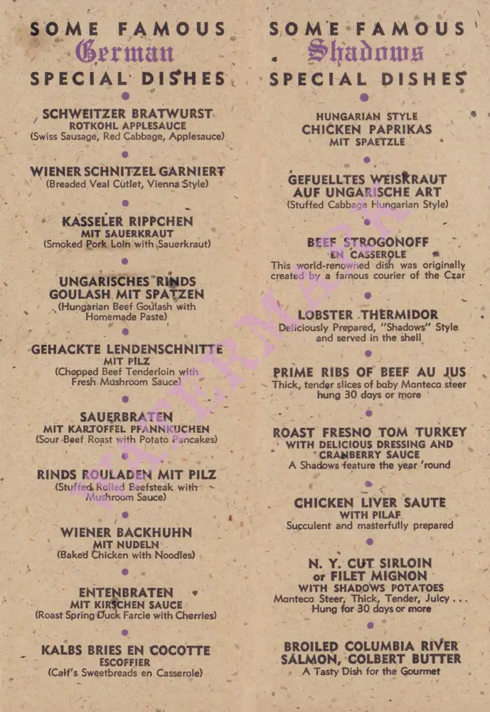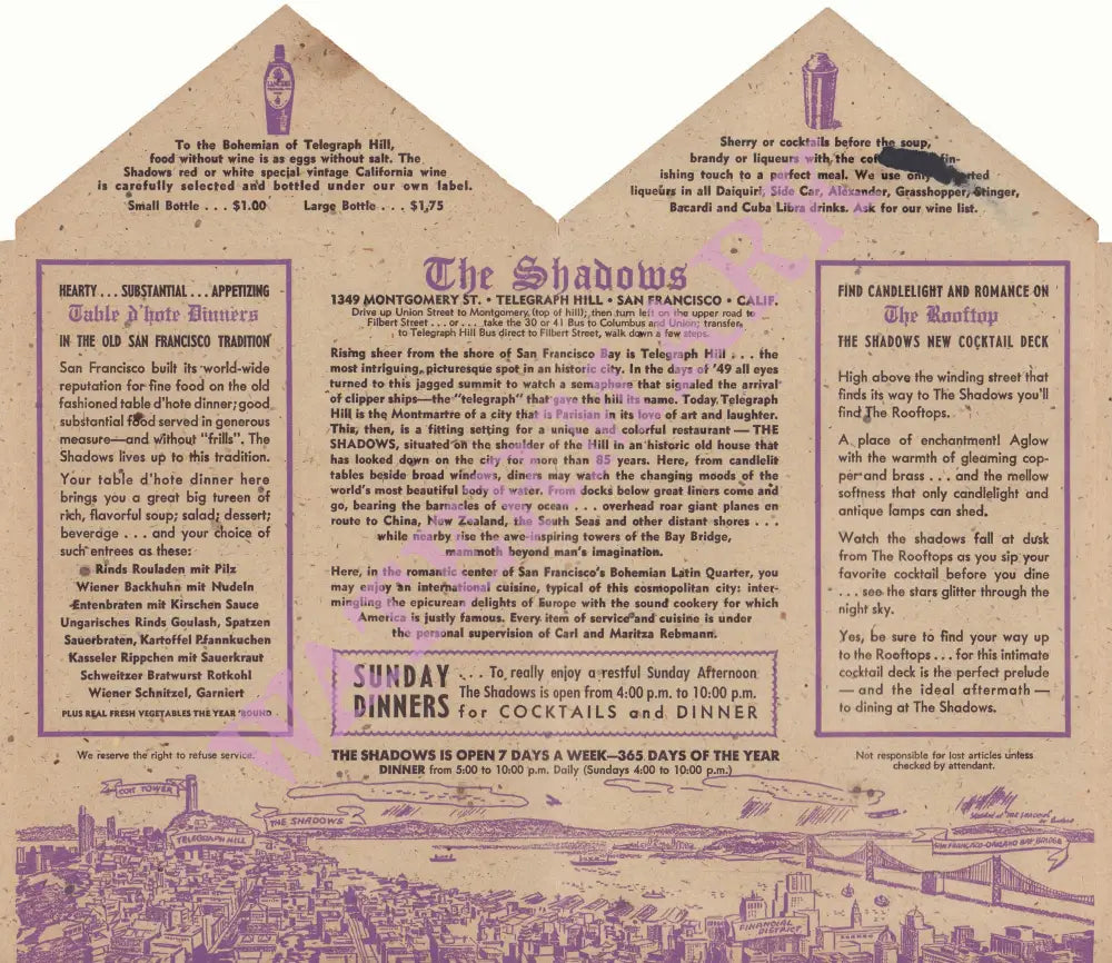 The Shadows opened in 1932 on Telegraph Hill, then a bohemian area full of artists and poets who wanted to turn the neighborhood into a San Francisco version of Paris’s Montmartre - hence this cover illustration of an artist and his muse and dancing and merriment downstairs.