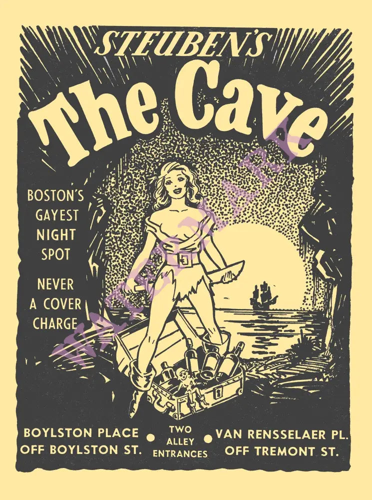This marvelously kitschy menu cover came from The Cave, part of the famous Steuben's empire in Boston. Opened in 1945 by brothers Max and Joe Schneider, it was the city's premier nightspot for two decades.There were floor shows nightly, big bands performed and The Rat Pack made appearances here. It was also where comedian Jerry Lewis first saw his name in lights: "The sign at Steuben's read Jerry Lewis — Good Steaks, he said, laughing. What was supposed to be a 2-week stay stretched to 47. I practically lived on Boylston Street."