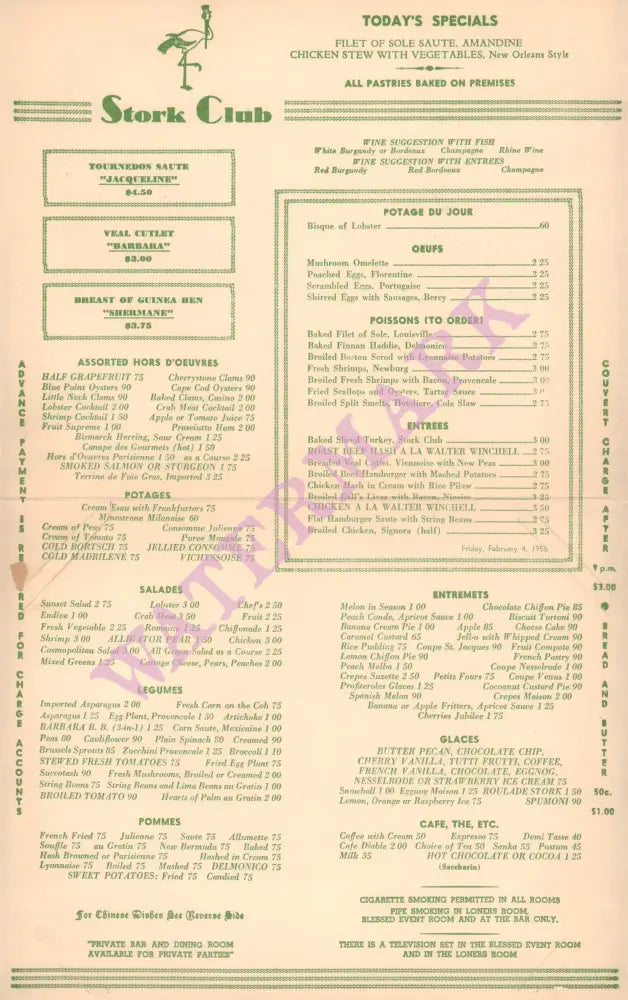 "Stork Club: Sherman Billingsley’s “glammer school,” strict in its standards any infraction of good manners in punishable by quiet but prompt expulsion and permanent blacklisting. Even the atmosphere you breathe is specially cleaned and filtered. Lighting is just right and service incredibly wonderful. Food? Anything you desire. Drinks? Any brand you name. If your party is sizeable and squired by someone of the successful business-executive type, the waiter will look surprised if no champagne is ordered.
