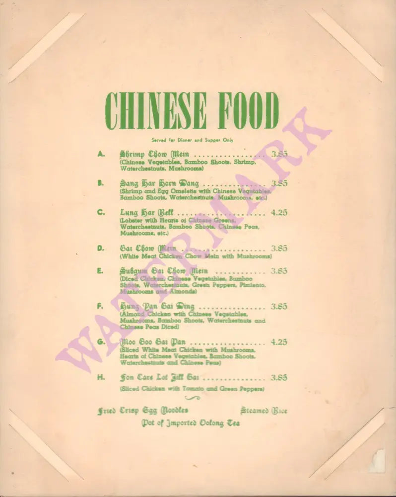 Layout consists of; islanded bar confronting you as you enter; cocktail lounge, off which are the glassed-in main dining room ( dining and dancing) and the Club Room ( small, quiet, seating only about 100) and upstairs a small Loners’ Room for singleton eating and the Blessed Event Room for private-party occasions.