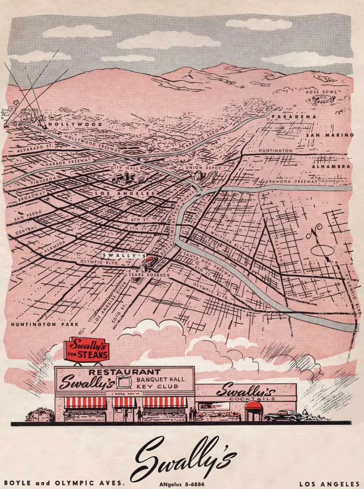 Directly opposite the Sears Roebuck building in downtown Los Angeles, California, Swally’s was a restaurant and cocktail bar, with banqueting facilities.