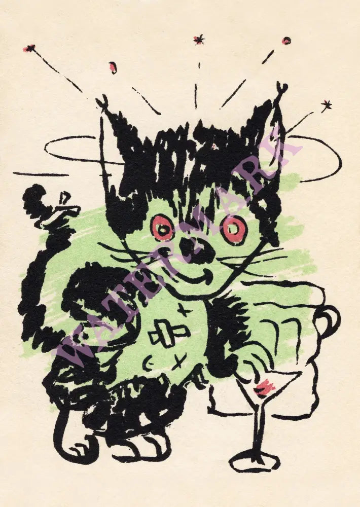 This menu cover of a scrappy black cat – his body is beaten up and bandaged and he has a defiant and worse-for-wear expression on his face – is from one of San Francisco’s most iconic bars.