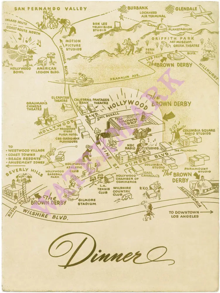 The Brown Derby at 1628 North Vine Street in Hollywood was the second Brown Derby to open but quickly became the most famous and the place to see and be seen due to its proximity to the major movie studios. It made its debut on Valentine's Day 1929 and was open 24 hours a day. The Hollywood Brown Derby was the preferred hang out for the gossip columnists (they and the movie executives loved the innovation of tableside phones) and late nights turned into an unofficial club for Hollywood's elite. "Producer Darryl Zanuck holding court, his dog tied up outside, while a drunk John Barrymore gobbled down the Derby's famous hot cakes with sausage.