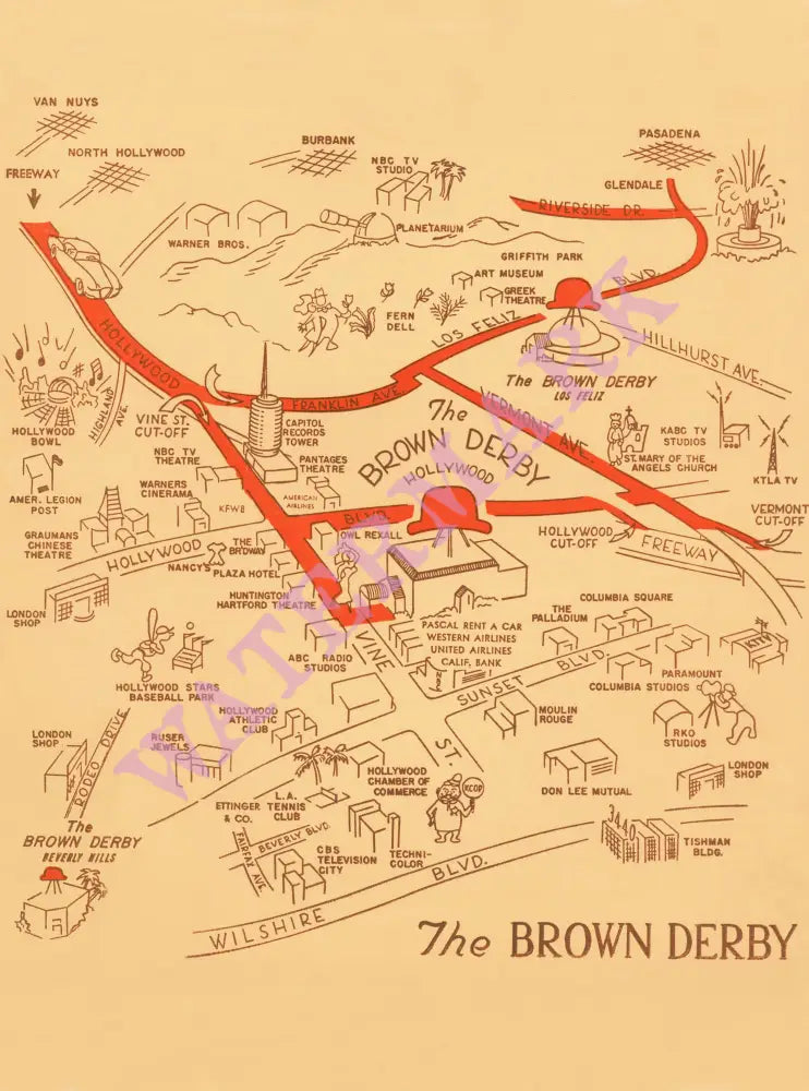 The Brown Derby at 1628 North Vine Street in Hollywood was the second Brown Derby to open but quickly became the most famous and the place to see and be seen due to its proximity to the major movie studios. It made its debut on Valentine's Day 1929 and was open 24 hours a day. The Hollywood Brown Derby was the preferred hang out for the gossip columnists (they and the movie executives loved the innovation of tableside phones) and late nights turned into an unofficial club for Hollywood's elite. "Producer Darryl Zanuck holding court, his dog tied up outside, while a drunk John Barrymore gobbled down the Derby's famous hot cakes with sausage."