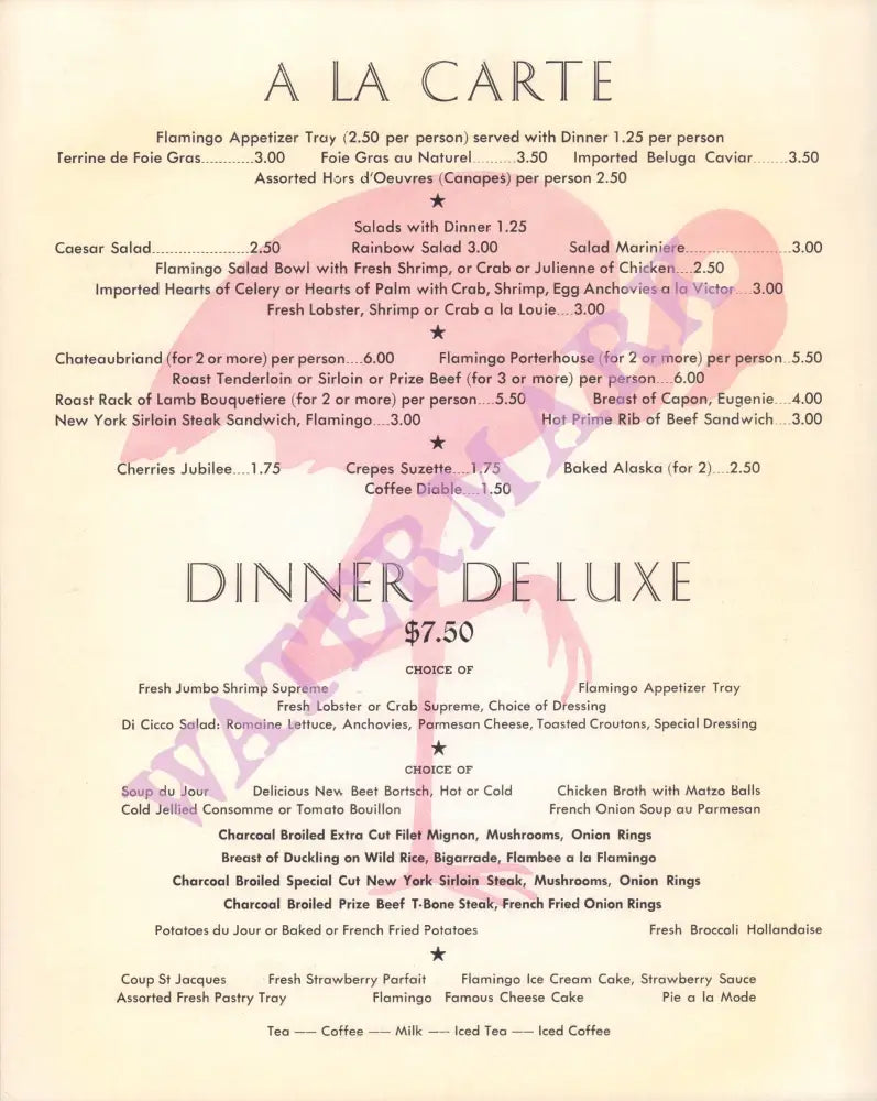 The oldest resort on The Strip ( complete with flamingos who live in a specially constructed wildlife habitat) now has a 72,299 square foot casino and 3,460 hotel rooms. Its architectural theme is reminiscent of Art Deco and Streamline Moderne style. It is owned and operated by Caesars Entertainment. This menu, we believe, is from the 1970s.